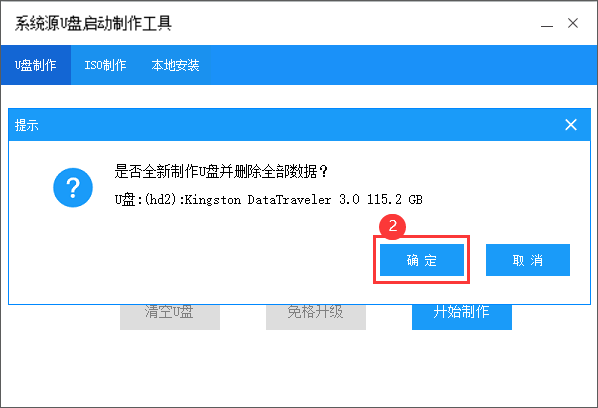 在弹出的信息提示窗口中,点击"确定"进入下一步操作。注意:U盘里如果有重要文件请保存到其它地方,如下图所示